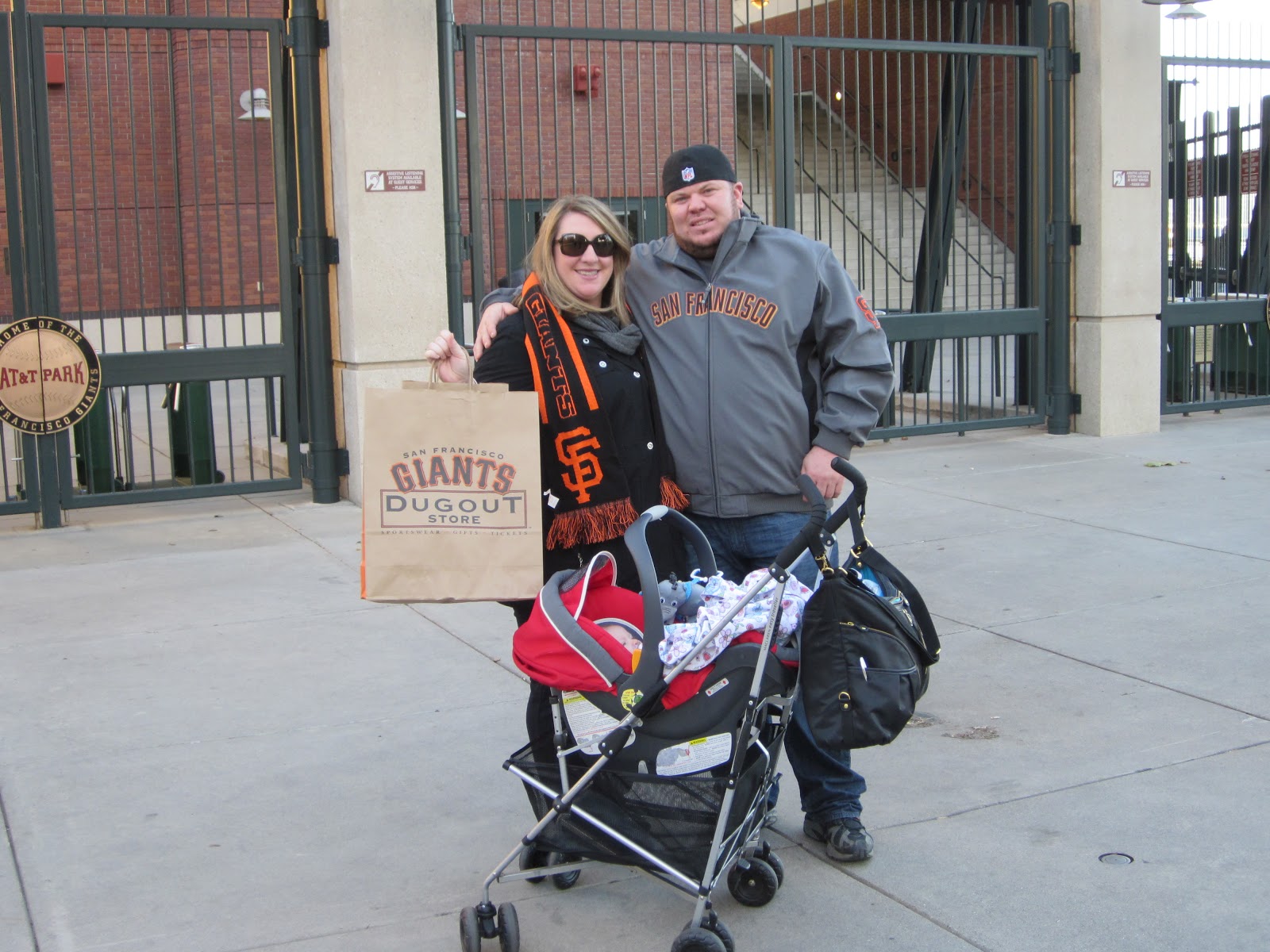 Later that week, Daddy and I were able to sneak away and take the day to spend with you and Grandma and Grandpa. It was a nice, clear day so we headed into the city to walk around and also visit Uncle T at work. Of course Daddy took us to AT&T park so we could update our Giants wardrobe. You were all smiles as we strolled around the Dugout store and around the park. We stopped for clam chowder at Fisherman's Grotto and enjoyed a killer sunset and views. Again, we were totally worn out!